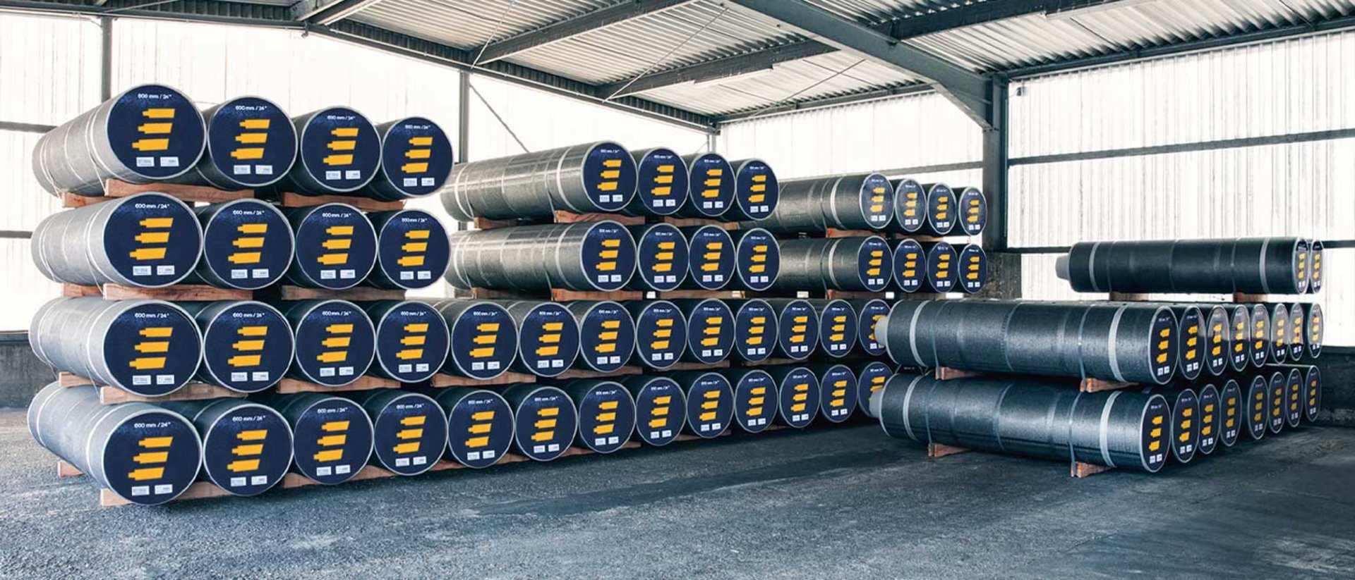 Graphite electrodes are a crucial technological component in the energy-saving production of steel from steel scrap. They enable the precise processing of scrap into new, high-quality steel grades in electric arc furnaces. The electrodes conduct the current directly into the furnace, where they create an arc hotter than 3,500 °C between themselves and the scrap, causing the steel to melt. The cylindrical graphite electrodes are manufactured in an extremely complex production process. Graphite electrodes are characterised by high thermal conductivity, low electrical resistance and high mechanical strength. They are also extremely heat-resistant.