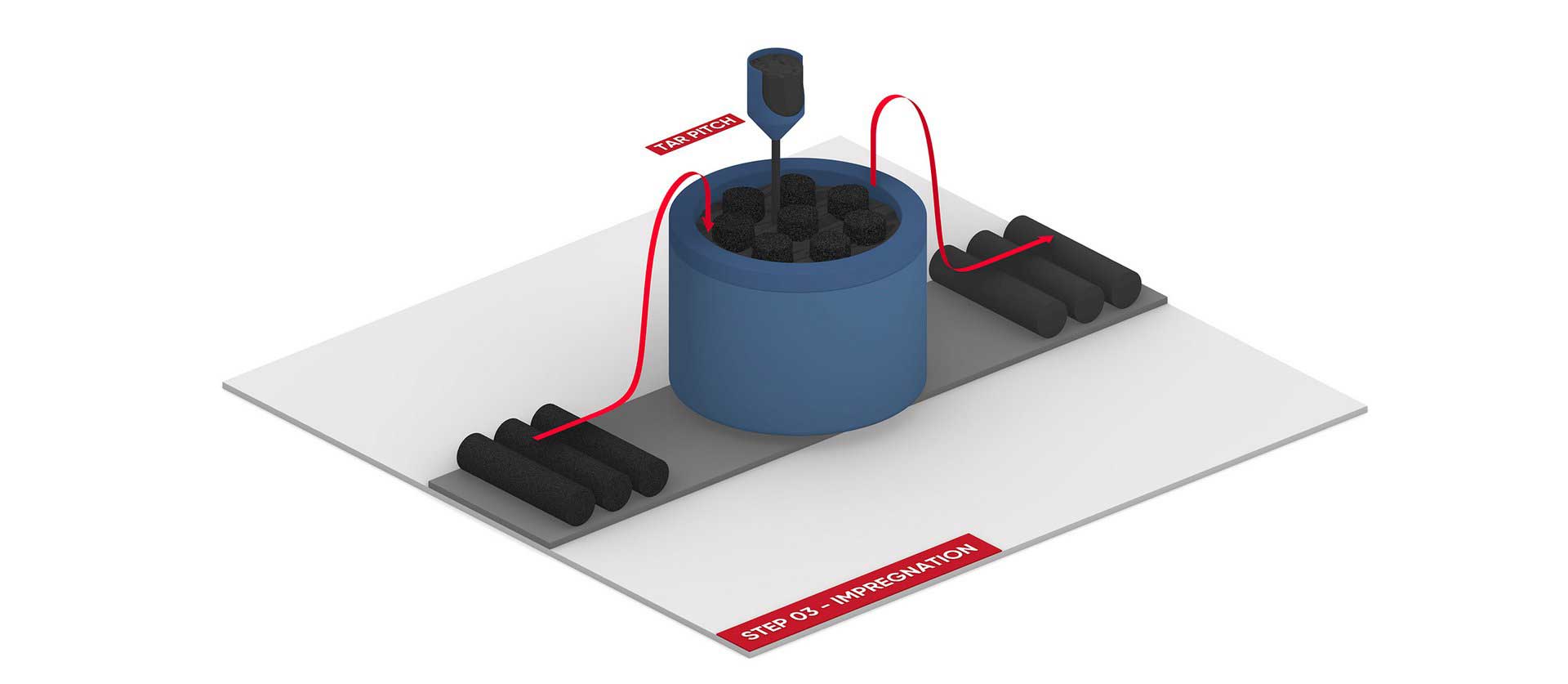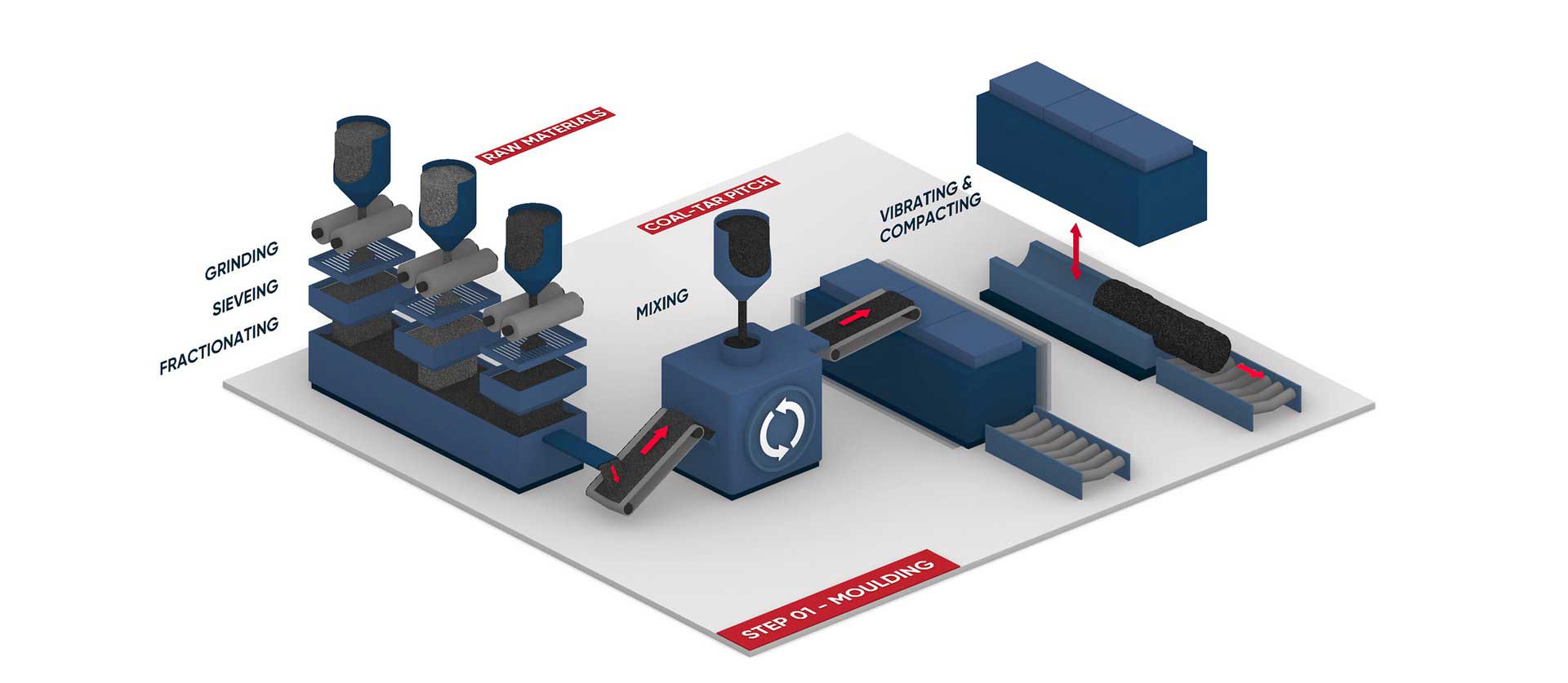 The production of graphite electrodes is highly complex in terms of manufacturing technology and takes several weeks. Needle coke and coal tar pitch are used as raw materials. The production process for manufacturing graphite electrodes is divided into the following steps: Forming, baking, impregnation, re-baking, graphitisation and machining.
