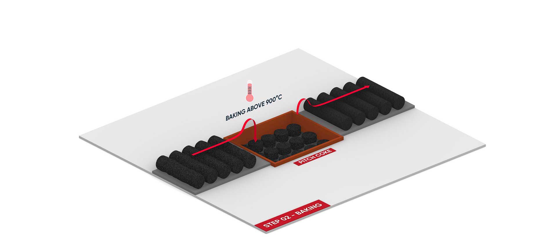 In a ring furnace fired with natural gas, the electrodes are baked at temperatures above 900°C for a period of 1 month. The combustion chamber into which the moulded parts are placed is filled with mine coke. On the one hand, this serves as protection against oxidation, and on the other hand, the material ensures that the temperature is transferred evenly to the moulded parts. After the baking process, the coke is completely sucked out of the combustion chambers, the electrodes are withdrawn from the chambers and the adhering filler material is removed. The coke is processed and is then available again for the next baking cycle.