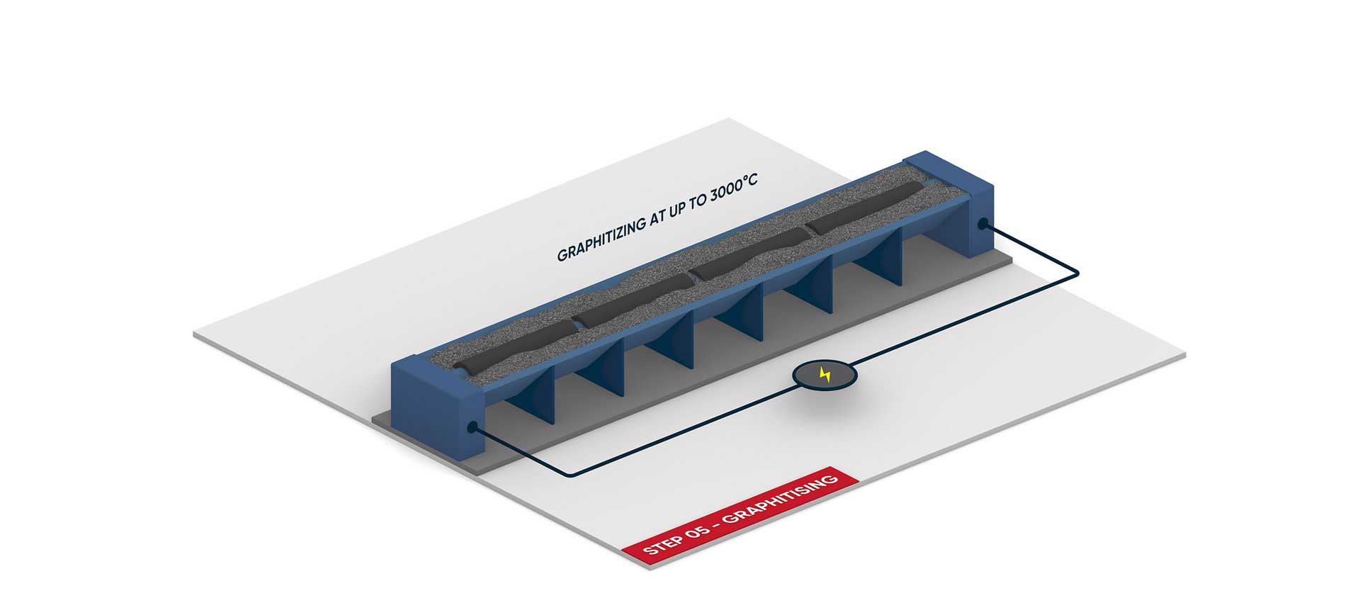 For graphitisation, the electrodes are joined together to form a strand, placed in a furnace and energised. The “resistance heating” heats the strand up to 3,000 °C. At these temperatures, amorphous carbon transforms into crystalline carbon (graphite). The process takes up to 15 hours. The subsequent cooling time is 1 week. The mine coke, which is also used here as a filling material, is then completely extracted, filtered and returned to the production process.
