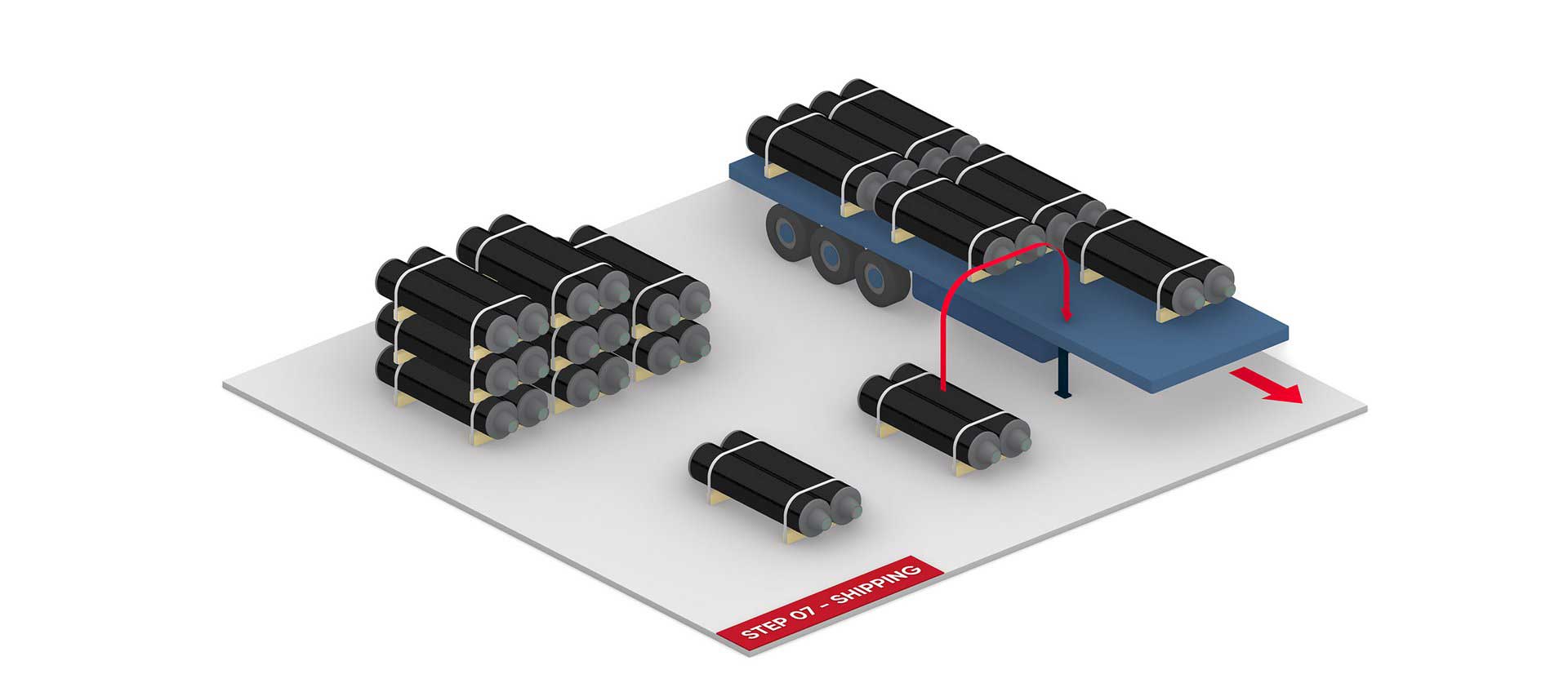 After removal from the autoclaves and subsequent cooling in a water bath, the electrodes are placed in re-baking furnaces fired with natural gas. In this further baking process, the tar pitch that has penetrated the bodies is converted into pitch coke at approx. 700 °C. This process takes several days. For operational reasons, the re-baking process can also take place in the ring furnace used in the baking operation described above, which adds four weeks to production time.